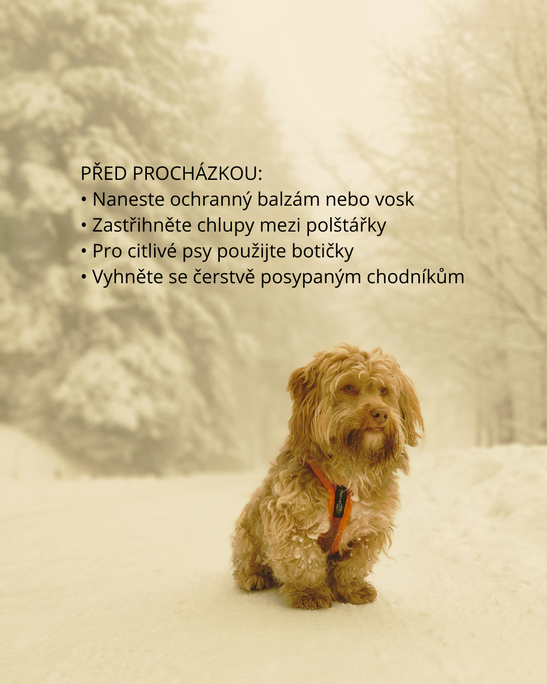 Tlapky jsou v zimě extrémně zranitelné. Před procházkou aplikujte ochranný balzám na polštářky (postačí vazelína). U dlouhosrstých plemen zastřihujte chlupy mezi polštářky, aby se netvořily ledové kuličky.