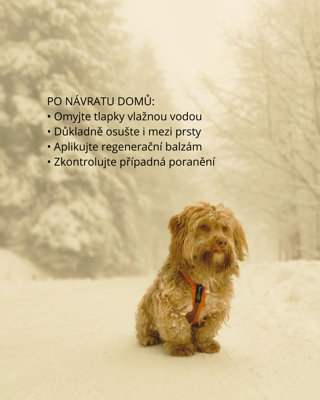 Po návratu tlapky důkladně omyjte vlažnou vodou, jemně osušte ručníkem a aplikujte regenerační balzám (např. bambucké máslo). Nezapomeňte na kontrolu případných prasklin nebo poranění.