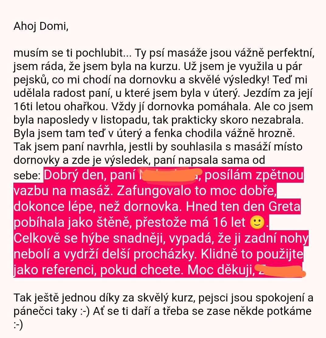 Využili jsme všechny nacvičené hmaty z předchozího dne. Kurz doporučuji všem majitelům pejsků, kteří chtějí svým chlupáčům zlepšit psychickou i fyzickou pohodu. Andrea Nekudová
