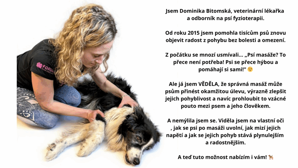 Fyzioterapii zvířat se věnuji s vášní již jedenáct let. Jako veterinární lékařka a certifikovaná fyzioterapeutka pro malá zvířata jsem objevila, jak úžasnou sílu má správně provedená masáž pro zdraví a pohodu psů.