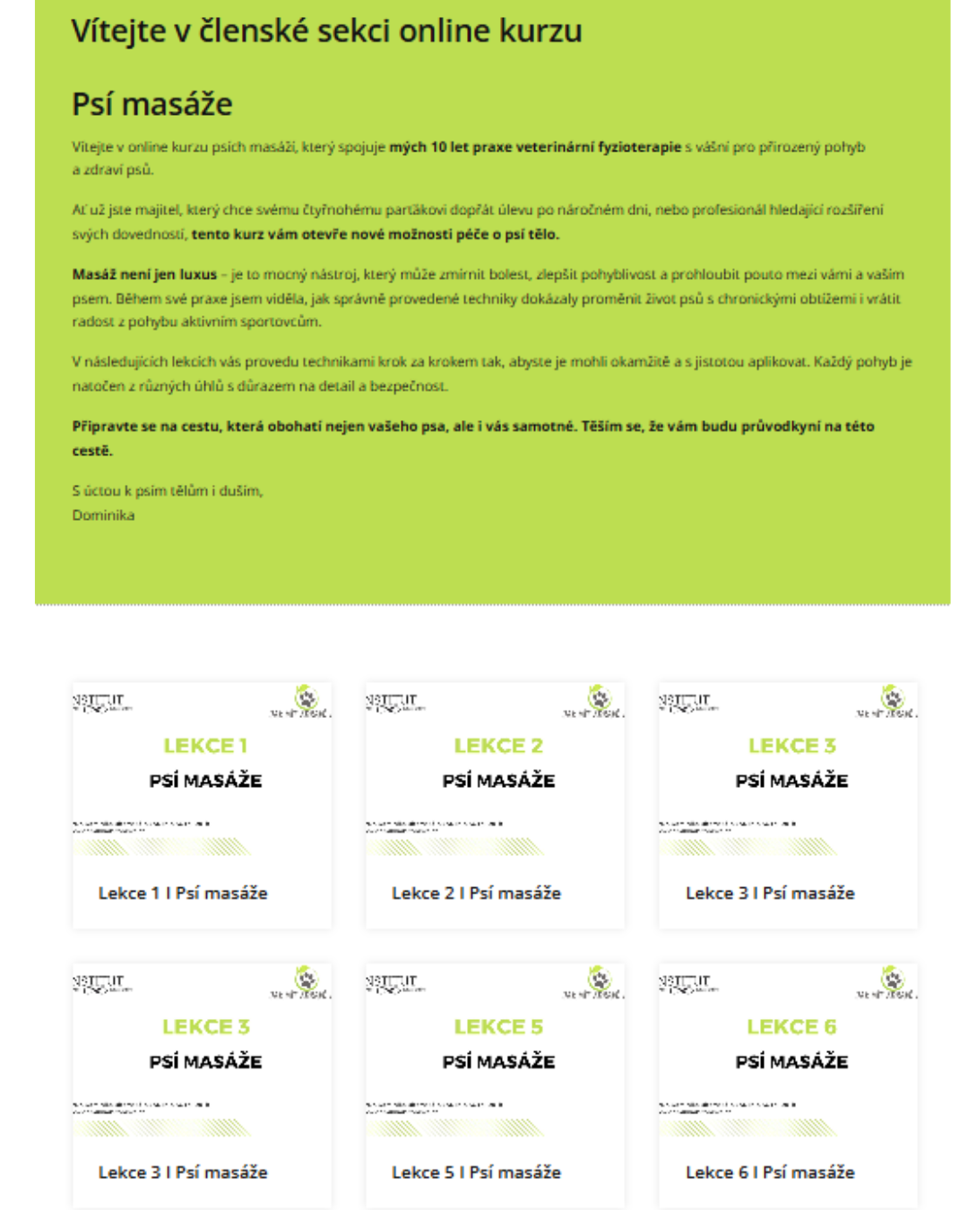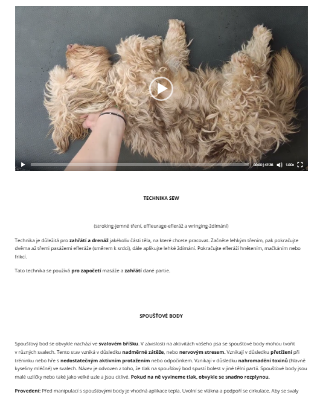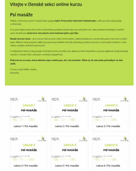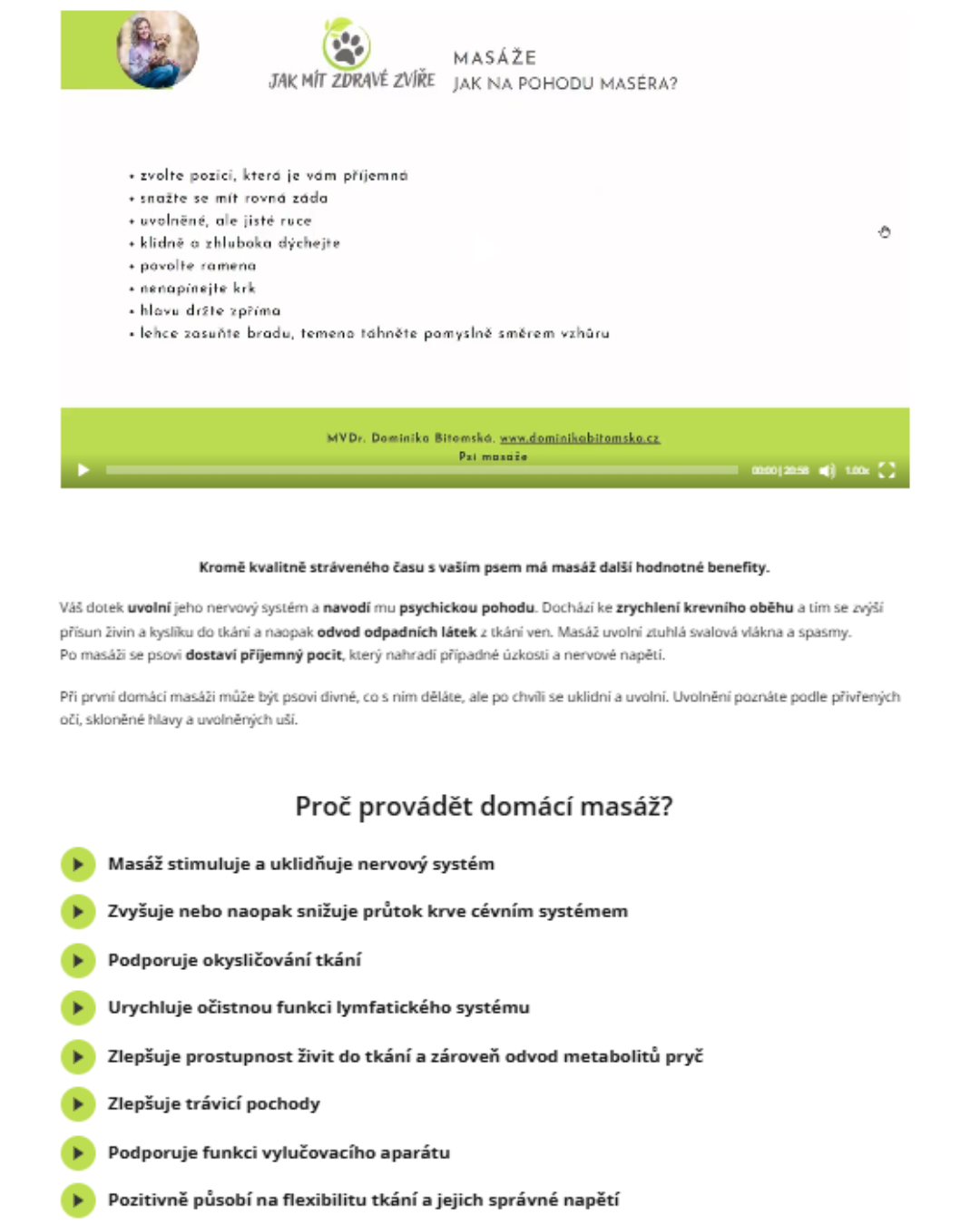 V tomto online kurzu vám předávám všechny techniky, které jsem za roky praxe zdokonalila. Věřím, že s těmito znalostmi může každý majitel významně přispět ke zdraví a pohodě svého čtyřnohého parťáka, a to přímo v pohodlí domova.